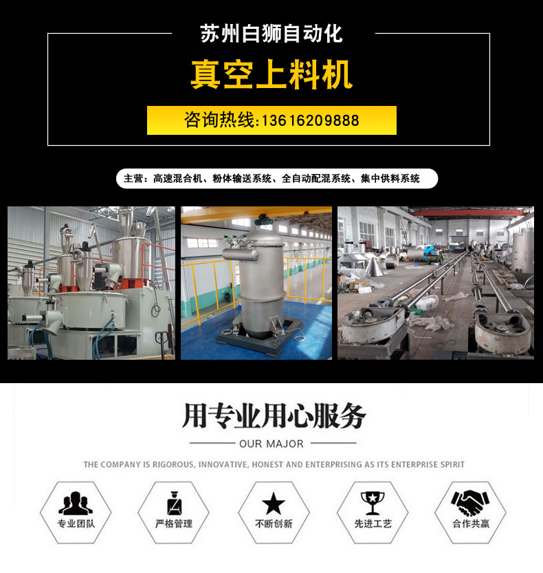 5、真空上料機(jī)節(jié)省能耗,料滿時自動關(guān)閉電源,料不夠時自動加料。